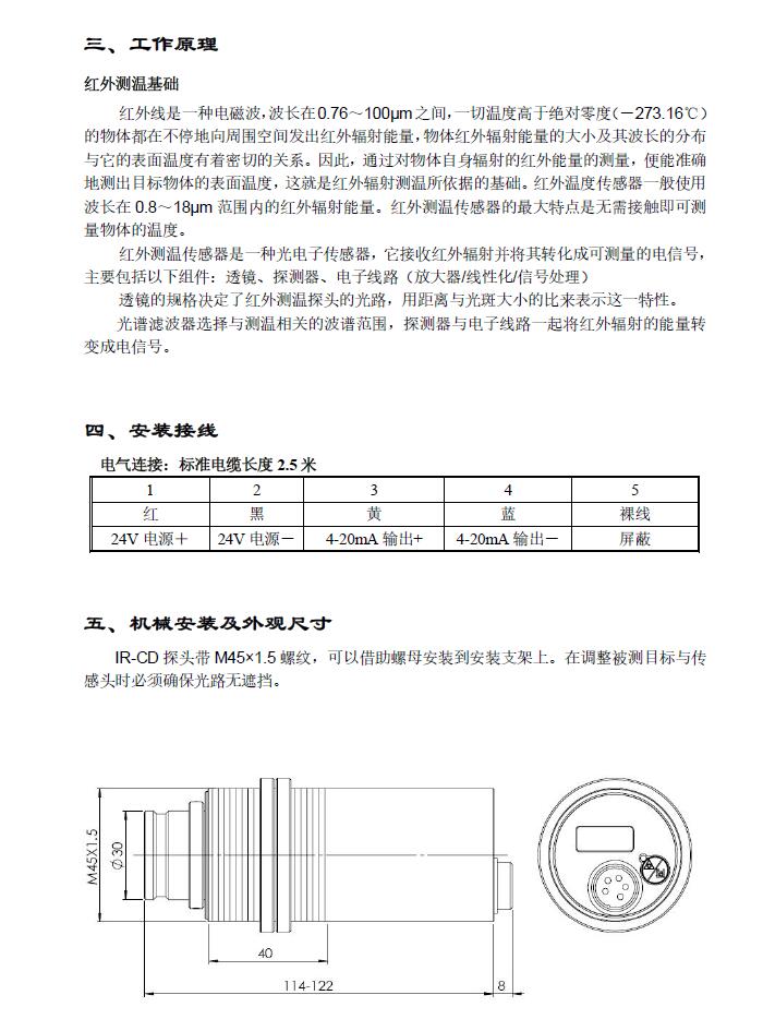 IR-CD 系列紅外測溫傳感器的工作原理:紅外線是一種電磁波,波長在 0.76~100μm 之間,一切溫度高于絕對零度(-273.16℃)的物體都在不停地向周圍空間發出紅外輻射能量,物體紅外輻射能量的大小及其波長的分布與它的表面溫度有著密切的關系。因此,通過對物體自身輻射的紅外能量的測量,便能準確地測出目標物體的表面溫度,這就是紅外輻射測溫所依據的基礎。